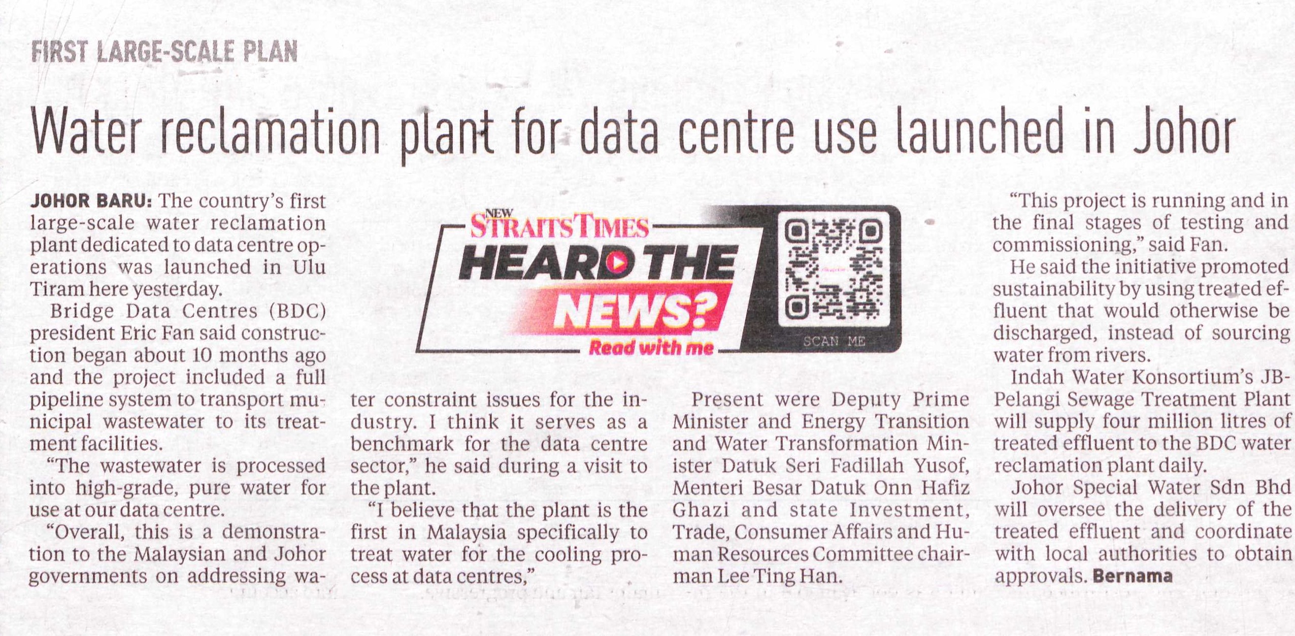 Water reclamation plant for data centre use launched in Johor.