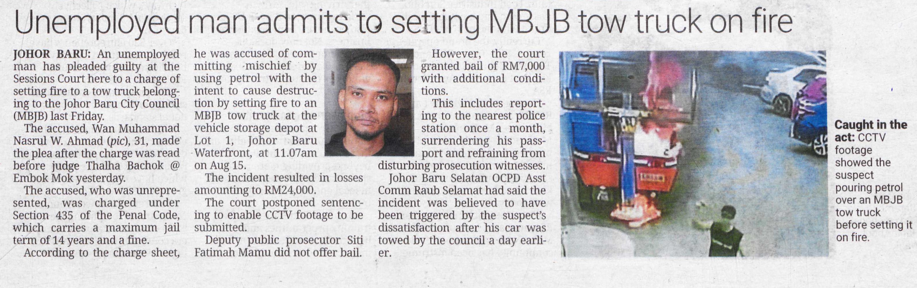 Unemployed man admits to setting MBJB tow truck on fire